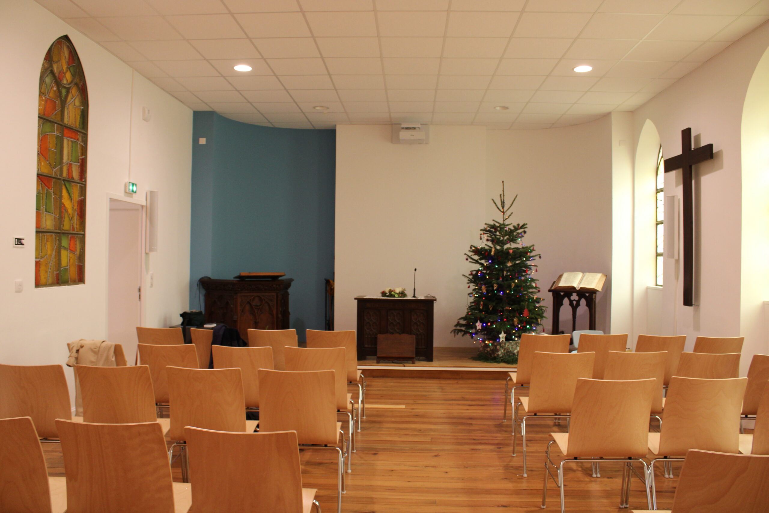 La salle de culte, modernisée et rénovée (multimédia et sonorisation) peut s’agrandir sur le coté les jours d’affluence.